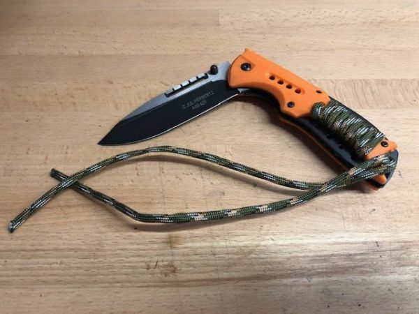 Couteau HERBERTZ, lame noire acier 420 à cran intérieur et à bouton double. Manche 12 cm ABS orange, avec clip et lacet paracord.
